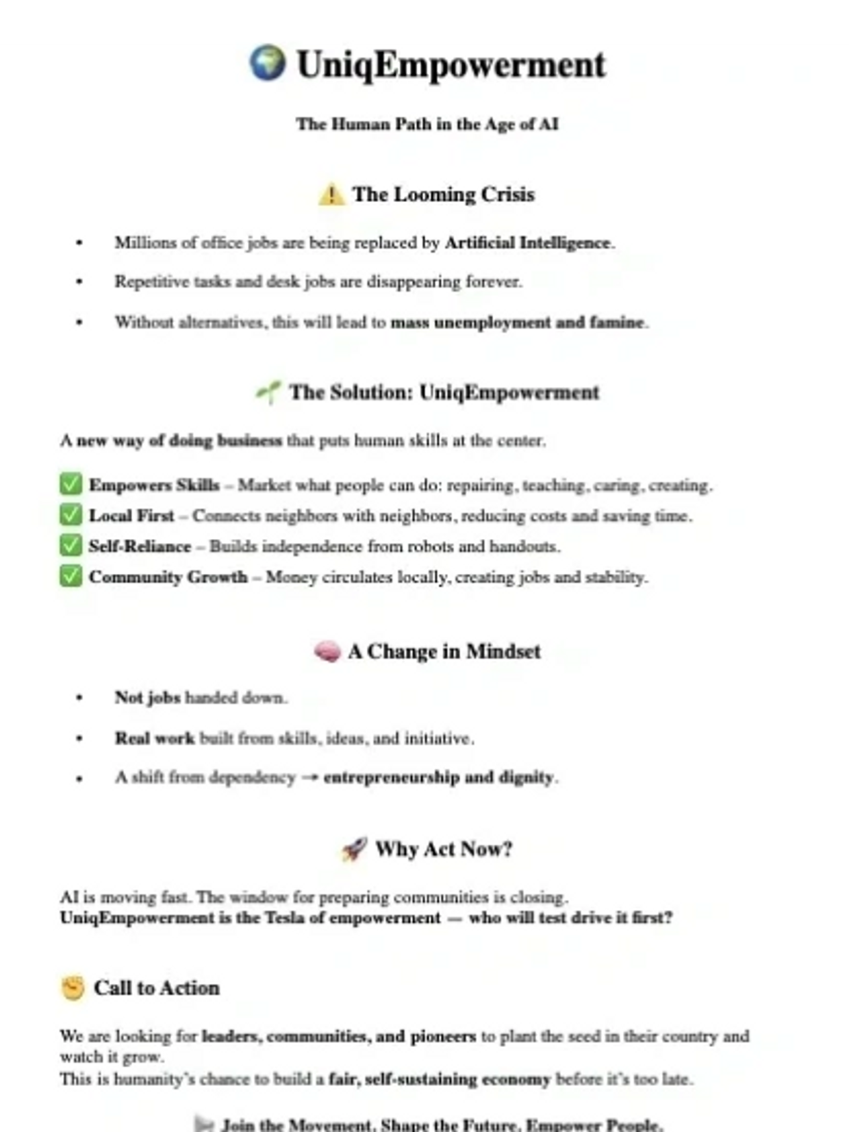 The risk is immense, but the opportunity is greater. By fiercely defending and cultivating the uniquely human domains of purpose, meaning, ethics, and connection, UniqEmpowerment becomes the essential layer that gives Super AI a positive and purposeful direction.
